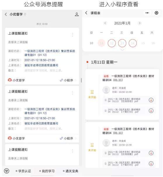 2. 智能直播课前通知,开课前两天,开课前两个小时,都能收到小优督学的课前提醒,让每位学员不错过每节直播课;