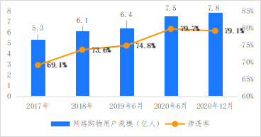 图1 2017-2020年我国网购用户规模及渗透率