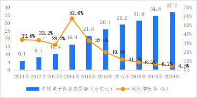 图2 2011-2020年我国电子商务交易额及增速