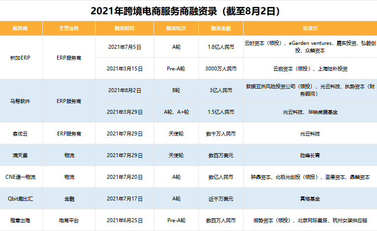 ERP被大量投资的背后,是跨境电商快速发展的信号。近年来,包括积加ERP、马帮软件、客优云、店小秘、领星ERP等服务企业融资额都在亿元级别。从资本垂青中,我们不难感受到来自服务生态新势力的赋能价值。
