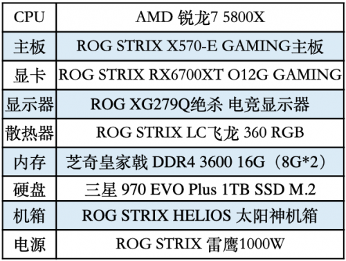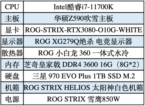根据推荐配置,在此为大家分享一套最新第11代酷睿游戏平台:以华硕Z590吹雪主板为核心,搭配Intel酷睿i7-11700K处理器、ROG-STRIX-RTX3080-O10G-WHITE电竞显卡等配件,还有ROG玩家国度全家桶信仰之力加持,颜值爆棚,战力爆表!