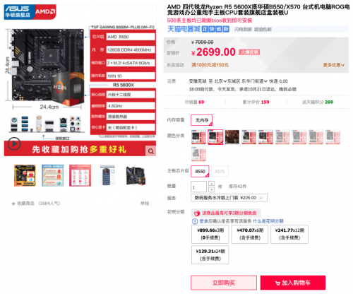 另外天猫商城还有华硕B550重炮手WIFI主板搭R5 5600X处理器套包,火爆促销2699元,另享满减活动与3期免息福利,入手良机不容错过。购买链接:https://detail.tmall.com/item.htm?id=628624072273&skuId=4663877274113