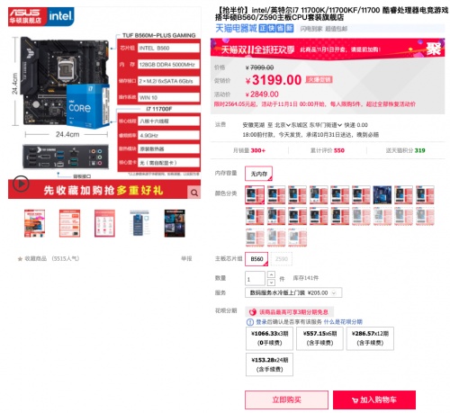 且天猫商城还有华硕B560重炮手主板搭i7-11700F处理器套包,活动价2849元,更有3期免息福利,感兴趣的小伙伴快快加购。购买链接:https://detail.tmall.com/item.htm?id=639375864946&skuId=4595712940005