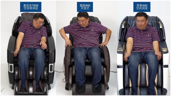 从尺寸来看,傲胜860,奥佳华7608和荣泰A60更轻量化一些,而这样的功能是需要牺牲一定的功能来实现,坐上去会露出上半身,不能包裹全身,头部和胸腹外露,开放式的设计缺乏私密性;