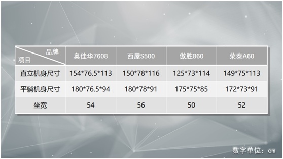 首先是外观尺寸上,颜值各有千秋,但坐宽,西屋更优。奥佳华7608、傲胜860、西屋S500、荣泰A60的坐宽分别是54、50、56、52,单位厘米。西屋S500能够包裹住体型更大的人群,家中高矮胖瘦,男女老少都能用。