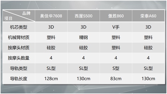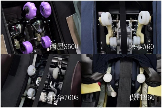最为核心的机芯、导轨、气囊三大块,奥佳华7608、傲胜860、西屋S500、荣泰A60都是采用3D机芯(所谓V手机芯其实也是上下左右前后按摩,等同于3D),按摩头数量都是4个,而西屋S500的机械臂和机芯底板材质相比其他三款,采用质地更好的精钢,寿命更长,更加耐用;导轨方面,除去傲胜860采用了传统的S型导轨外,其余三款都采用迭代升级后的SL型导轨,其中西屋S500和荣泰A60的导轨长度最长,都是130cm;