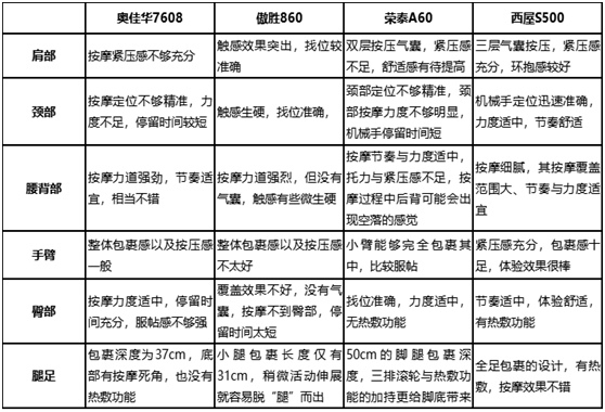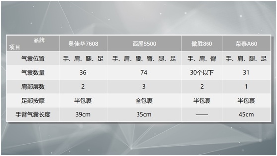 四款产品气囊按摩部位以及各项参数如下表: