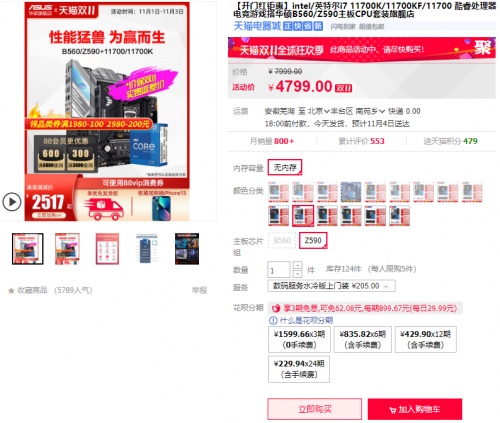 且天猫商城还有华硕Z590吹雪二代主板搭i7-11700K处理器套包,天猫双十一全球狂欢季来袭,活动价仅需4799元,享3期免息福利。购买链接:https://detail.tmall.com/item.htm?id=639375864946&skuId=4595712940016