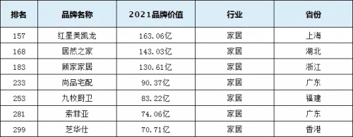 在家居领域,共有红星美凯龙、居然之家、顾家家居、尚品宅配、九牧厨卫、索菲亚、芝华仕等7个家居品牌上榜《2021中国品牌500强》榜单,品牌价值为163.06亿、143.03亿、130.61亿、90.37亿、83.22亿、74.06亿、70.71亿,分别位列第157位、168位、183位、233位、253位、281位、299位。