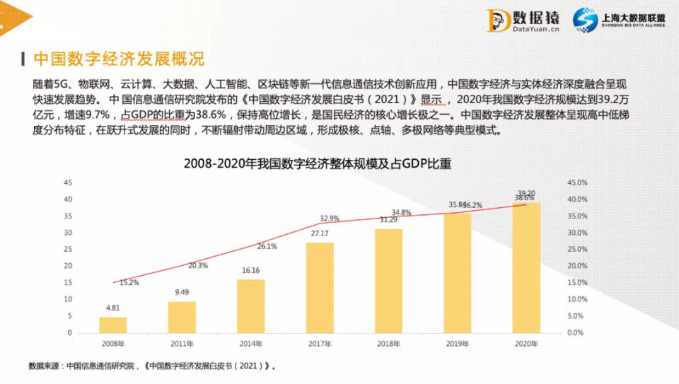 据中国信息通信研究院发布的《中国数字经济发展白皮书(2021)》显示,2020年我国数字经济规模达到39.2万亿元,占GDP的比重为38.6%。并且,数字经济的增速9.7%,保持高位增长,是国民经济的核心增长极之一。