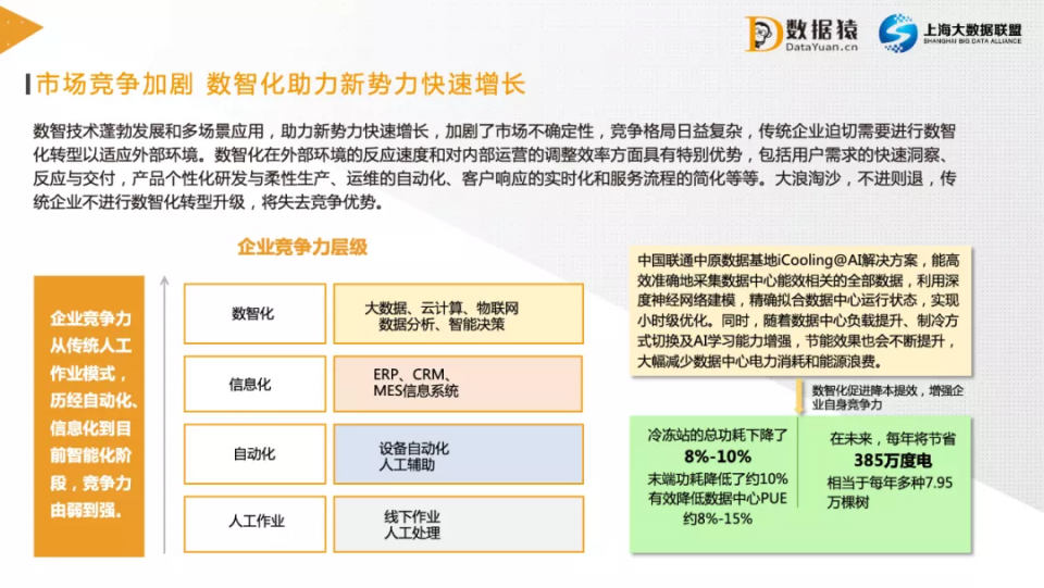 实践证明,通过数智化升级,企业的经营管理效率的确可以得到明显提升。以数据中心运维为例,基于中国联通中原数据基地的iCooling@AI解决方案,能高效准确地采集数据中心能效相关的全部数据,利用深度神经网络建模,精确拟合数据中心运行状态,实现小时级优化。经过智能化升级,该数据中心冷冻站的总功耗下降了8%-10%,末端功耗降低了约10%,有效降低数据中心PUE约8%-15%。我们知道,数据中心是云计算厂商的主要成本,而电力消耗又是数据中心运维的主要成本。因此,通过AI技术降低功耗,进而显著降低数据中心运维成本,将使得云厂商在市场竞争中获得重要的竞争力,在价格战中也更有底气。