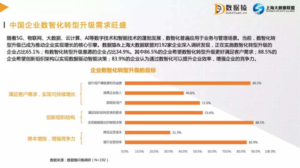 需求端的变化,也推动着供给侧的变革,提供产品、服务的企业也需要应需而变。当前,数智化转型升级已成为推动企业实现增长的核心引擎。数据猿联合上海大数据联盟对192家企业深入调研发现,65.1%企业正在实施数智化转型升级,34.9%企业有数智化转型升级的意愿。