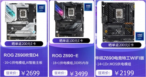 若你想要组建最新发布的第12代英特尔酷睿处理器电竞主机,那么华硕全新Z690系列主板将是你的不二之选。分别是吹雪家族最新成员华硕Z690吹雪D4(ROG STRIX Z690-A GAMING WIFI D4),狂欢价2699元(购买链接:https://item.jd.com/100027860514.html );潮流玩家最爱的ROG STRIX Z690-E GAMING WIFI,狂欢价3499元(购买链接:https://item.jd.com/100015146097.html );硬派玩家首选TUF GAMING Z690-PLUS WIFI D4,狂欢价2199元(购买链接:https://item.jd.com/100027860548.html ),晒单即返京东E卡,想要抢先体验最新一代电竞平台的小伙伴快来抢购吧。