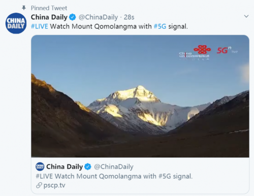 4月20日,在超过5200米的海拔上,零下十几度的严寒中,中国联通实现了珠峰观景台和珠峰大本营一号营地的5G信号全覆盖。4月22日,中国联通5G沃视频客户端依托5Gⁿ live直播平台正式上线了珠穆朗玛峰24小时不间断的5G+VR+4K超高清直播。通过直播画面,观众可以清晰地看到连绵的雪山在云层中若隐若现,日落的夕阳映照在山头,夜晚的繁星缀满天空……从此,珠穆朗玛不再遥不可及,“日照金顶”的美景尽在大众眼底。