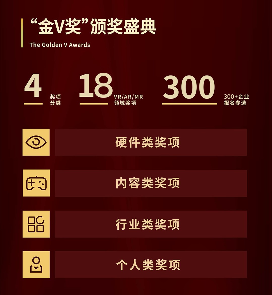 自2018年首届至今,虚拟与增强现实产业年会暨「金V奖」颁奖盛典已成功连续举办三届,是XR产业内最具有影响力的盛会之一,获得了行业人士的广泛好评,我们希望继续秉承初心,努力将「金V奖」打造成整个XR产业链上的从业者了解产业发展、接触优质资源的平台。