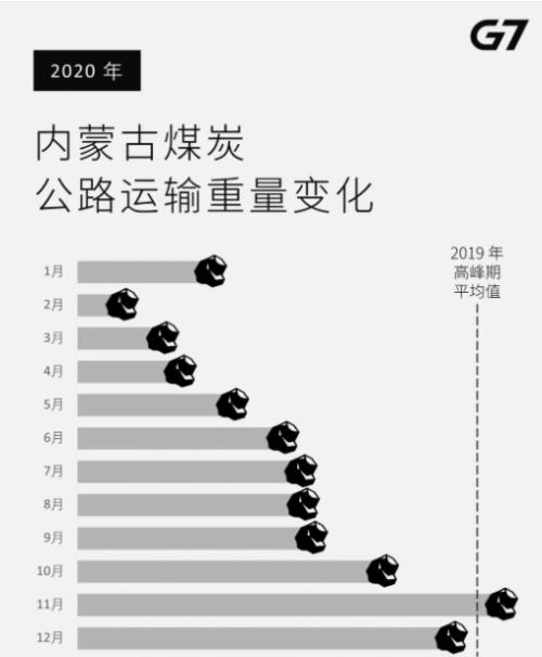 G7大数据显示,从内蒙古煤炭公路运输重量方面看,除11月外,其余月份数据均低于2019年高峰期平均值。2-4月因受春节、疫情影响,数据相对低迷。随着疫情逐渐好转,数据从5月份开始回暖,并于11月达到全年峰值。