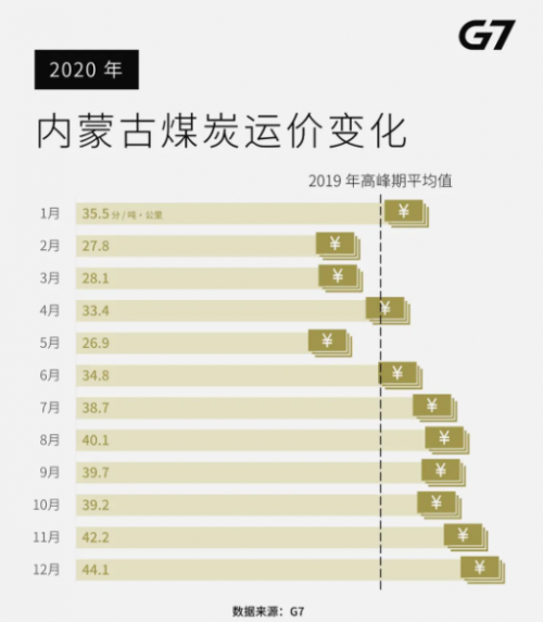 受燃料成本上升,煤炭运价也随着冬季用电和取暖的需求攀升,G7数据显示,内蒙古煤炭运价自供暖季以来呈上涨趋势,并大幅度高于2019年高峰期平均值。
