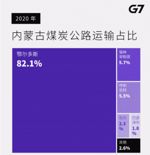 G7数据显示,从内蒙古煤炭公路运输占比方面看,鄂尔多斯凭借82.1%的份额成为2020年内蒙古煤炭吞吐量最大的城市,其余分别是锡林郭勒盟、呼和浩特、包头、巴彦淖尔。